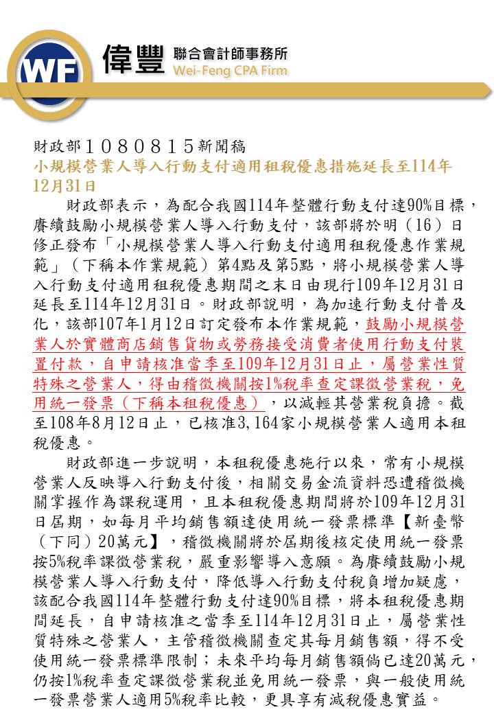 小規模營業人導入行動支付適用租稅優惠措施延長至114年12月31日