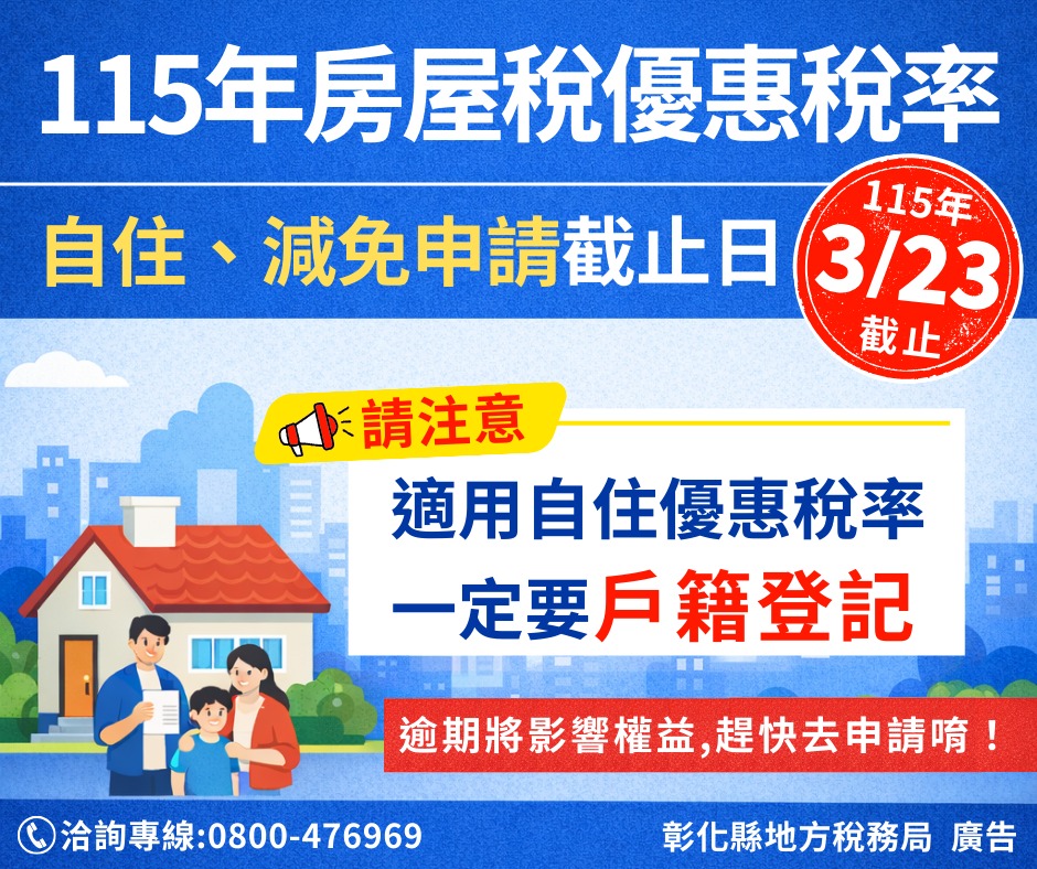 新購屋族以及房屋使用情形變更者看過來~👀 自用住宅房屋如符合以下三點條件,可於115年3月23日前申請變更,適用房屋優惠稅率,如果逾期申請就要再等一年才能適用囉!💨 ❶ 無出租、無營業使用 ❷ 供本人、配偶或直系親屬實際居住且於該屋辦竣戶籍登記 ❸ 本人、配偶及未成年子女全國持有不超過3戶等要件